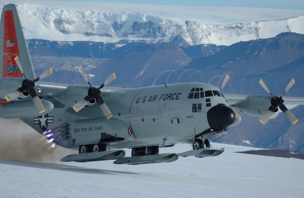 We also sometimes fly on the LC-130 which is flown by the New York Air National Guard. The “L” in LC-130 means that is has the skis on the landing gear as you can see below. It’s also called “The Hercules” or just Herc. I don’t like flying on the Herc because it’s slower, so it’s an 8 hour flight instead of 5 hours on the C-17, it’s also a lot louder inside for some reason, and it’s smaller so it’s more cramped.