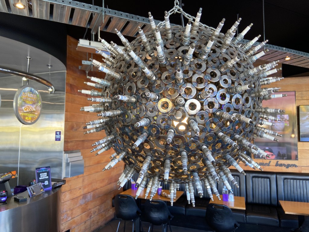 It’s a car themed burger place and I got the “American Muscle” burger, it’s really good. They also have this cool chandelier hanging up that has a bunch of spark plugs in it.