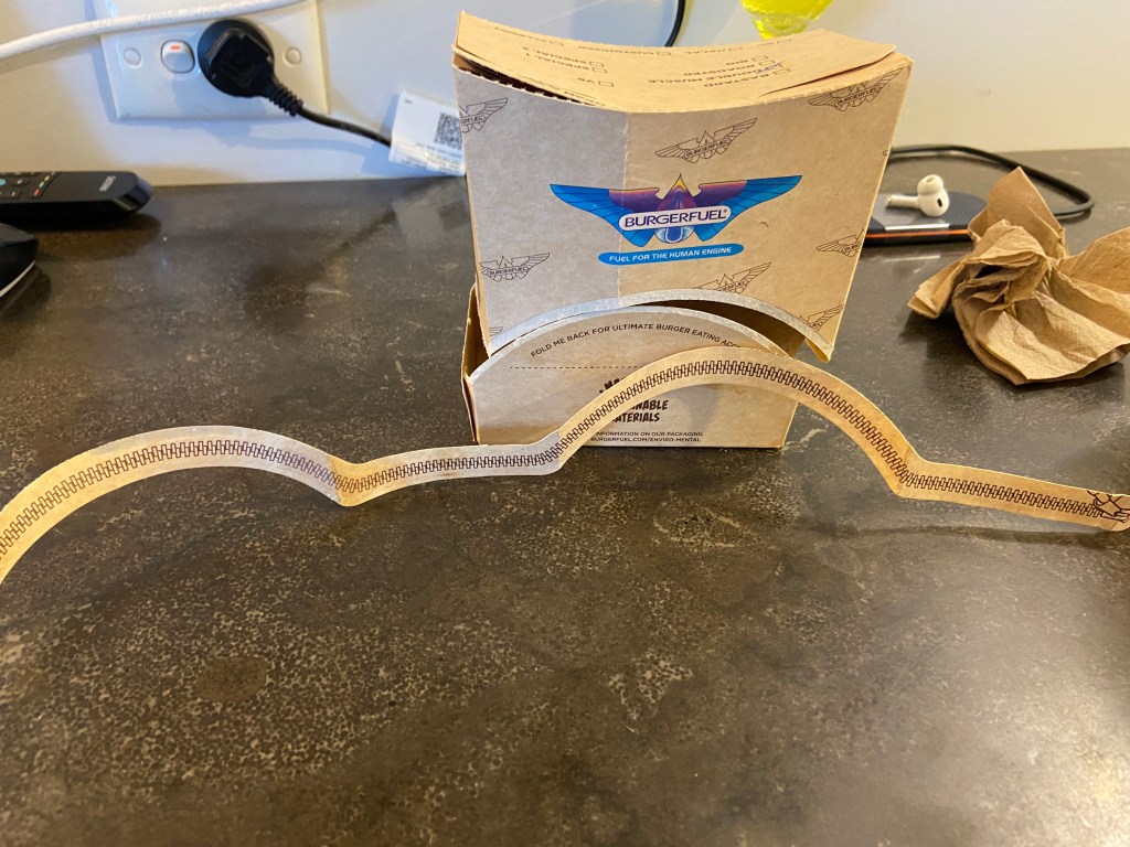The burger comes in this cool package. You just pull on the strip and it splits the package in two pieces.