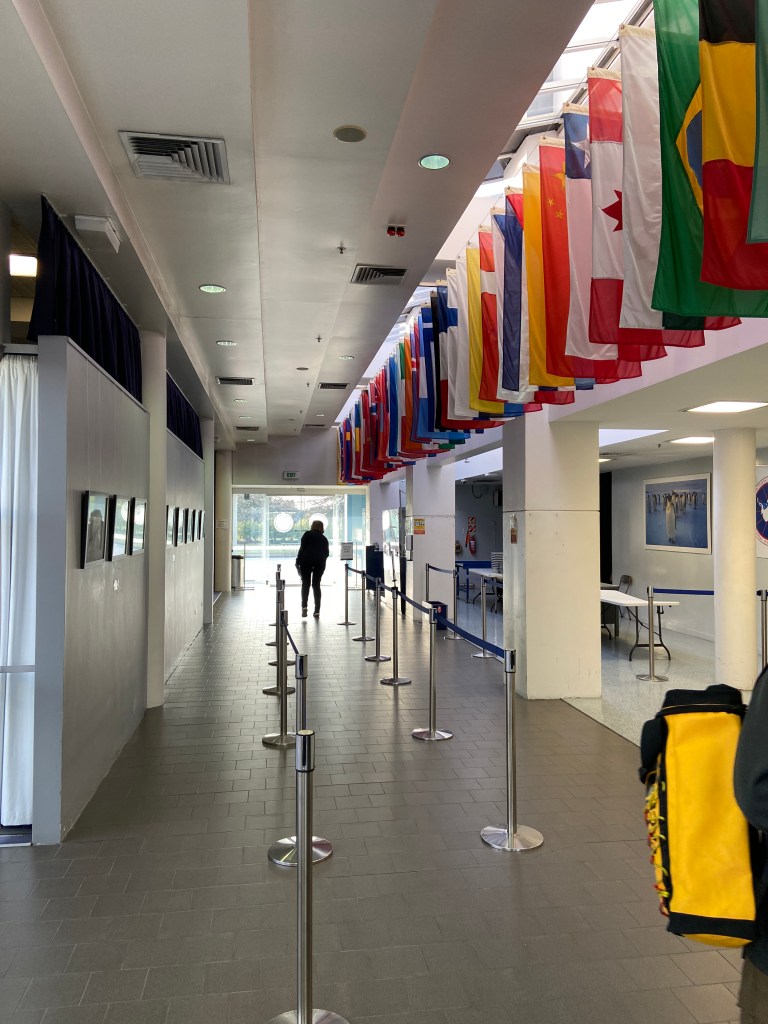 The next day we got back to the passenger terminal. This is right inside the door of the passenger terminal. Those are the flags of the nations who have signed the Antarctic Treaty. To the right of that person is where you take your bags and go through an X-ray machine and metal detection like you would at any other airport.
