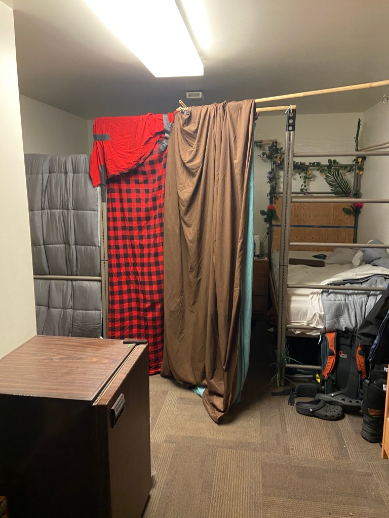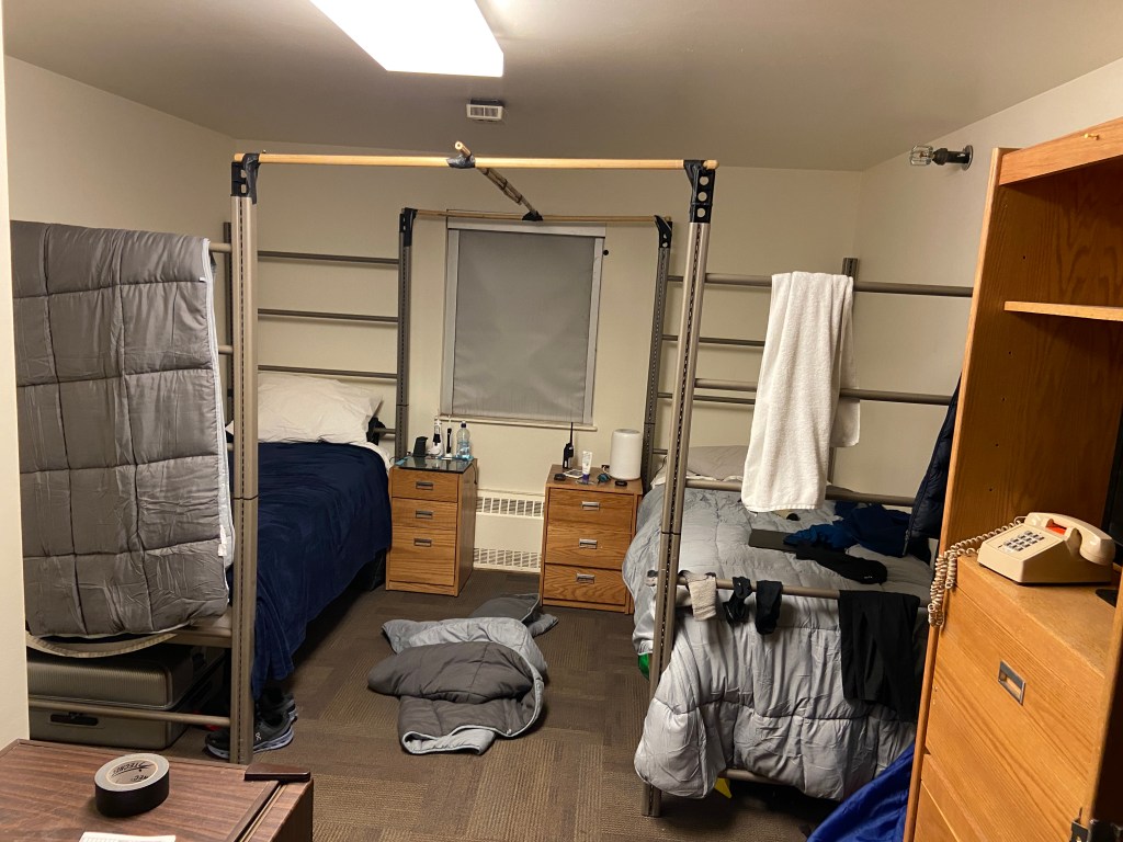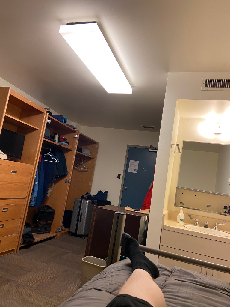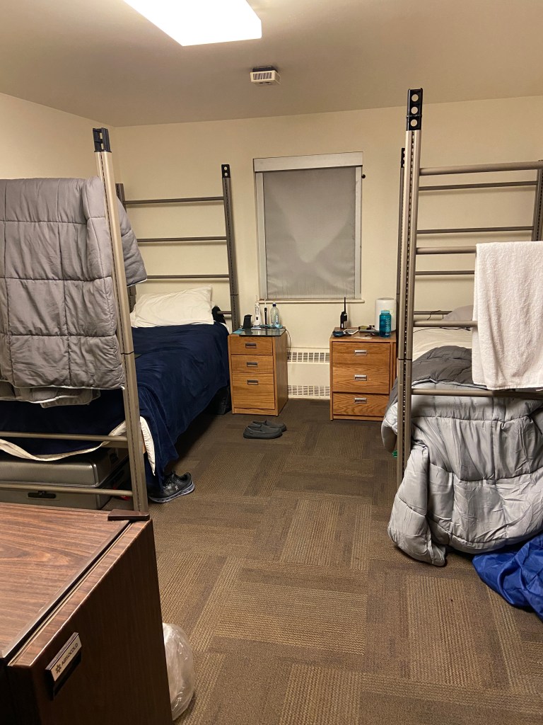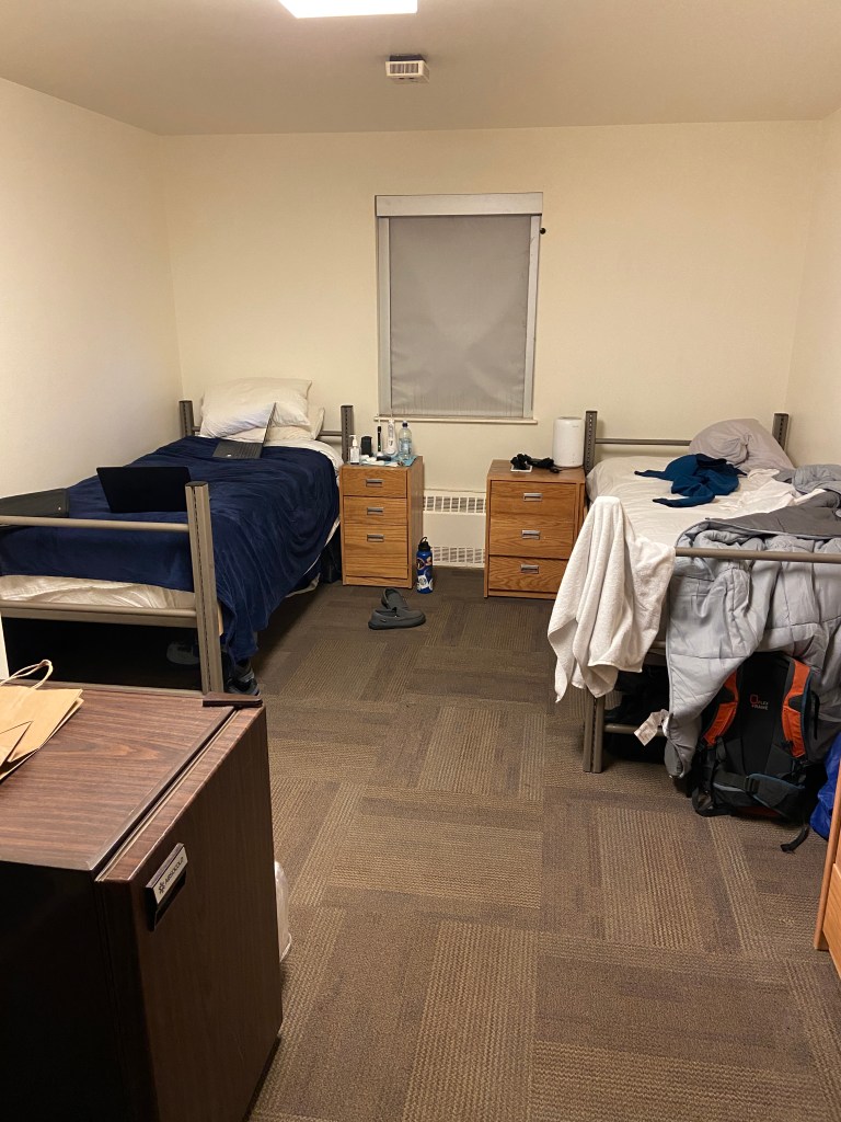 You can see that we each have a wardrobe the hang our clothes, a small fridge, and a sink in our room, and then our room shares a bathroom with the room nextdoor. You can’t see the bathroom, it’s behind the wall the sink is on.